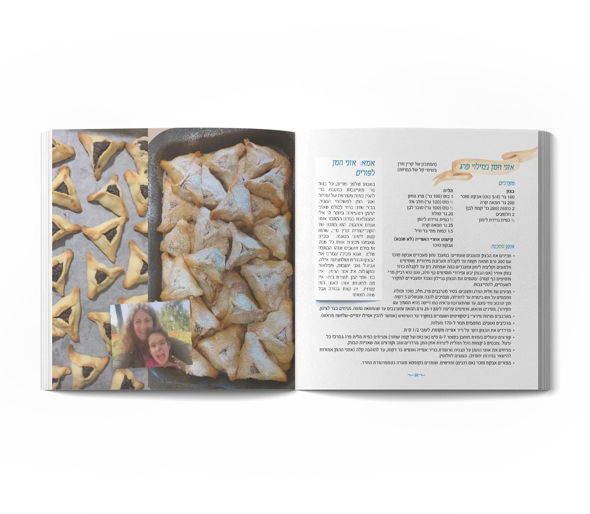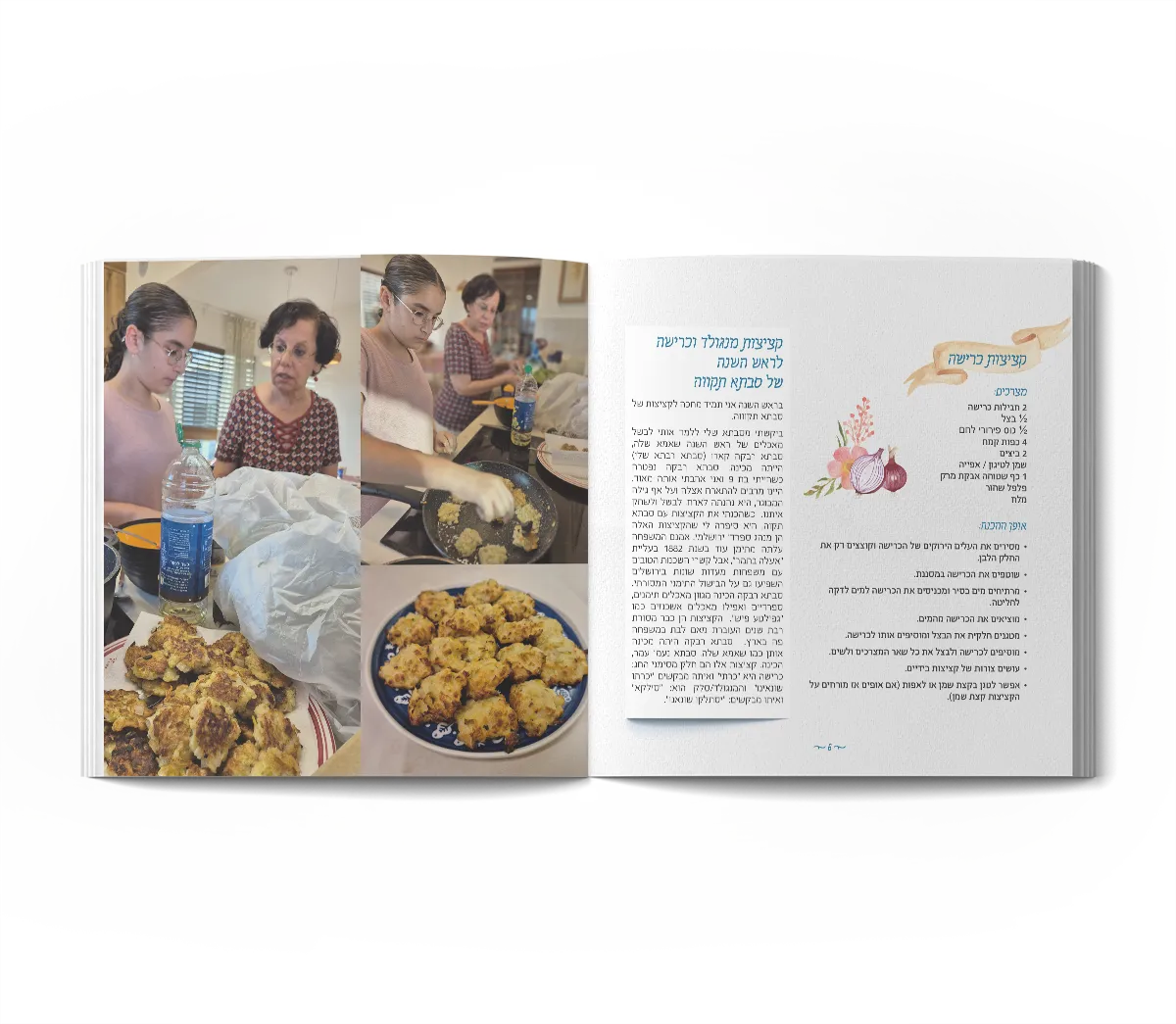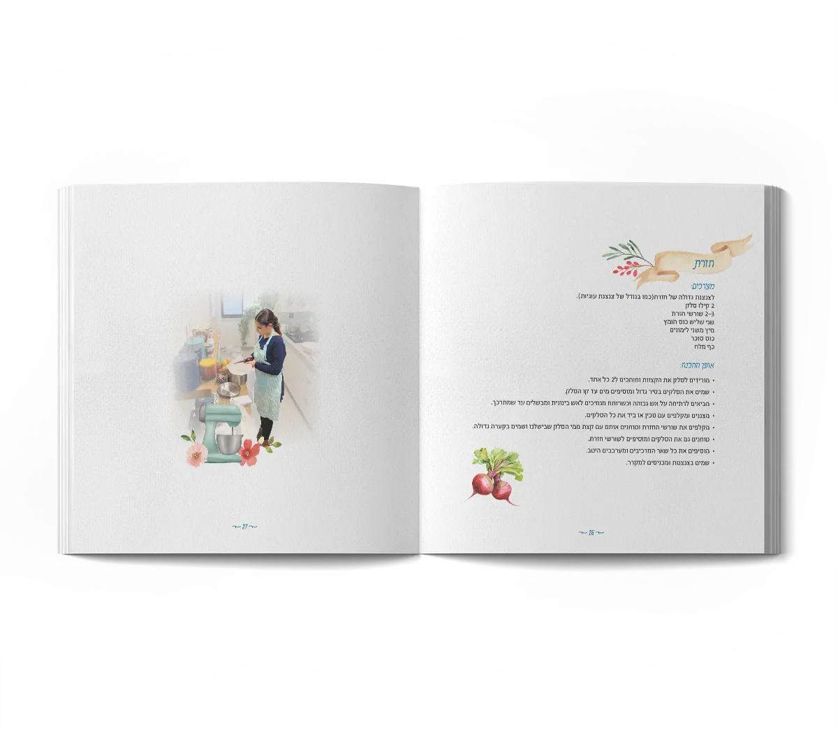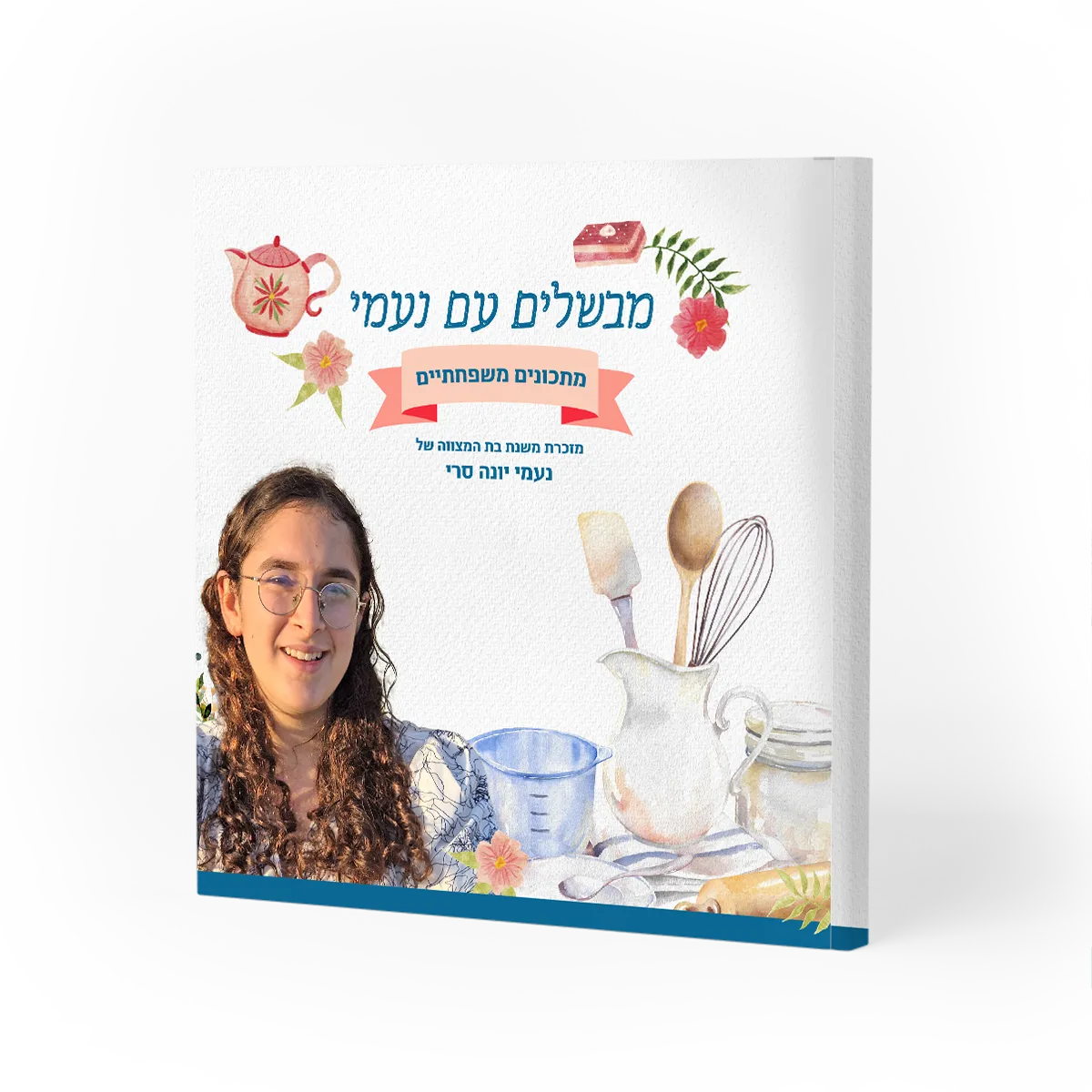 נ היא ילדה בשלנית, והיה נראה טבעי לעשות בשנת המצווה שלה פרוייקט בישול משפחתי – חוויה שגם מחברת למשפחה, גם מלמדת, וגם מהנה עבור כולם. אז במשך שנה היא בישלה, ליקטה מתכונים, טיפים וסיפורים מהמשפחה המורחבת, וקיבלה מבט מיוחד על המסורת והמשפחה. לקראת אירוע בת המצווה – ארזנו את כל המתכונים, התמונות והסיפורים בחוברת שמחזיקה בתוכה את העליזות וההנאה שבחוויה המשותפת. יופי של מזכרת לחלק באירוע בת המצווה!